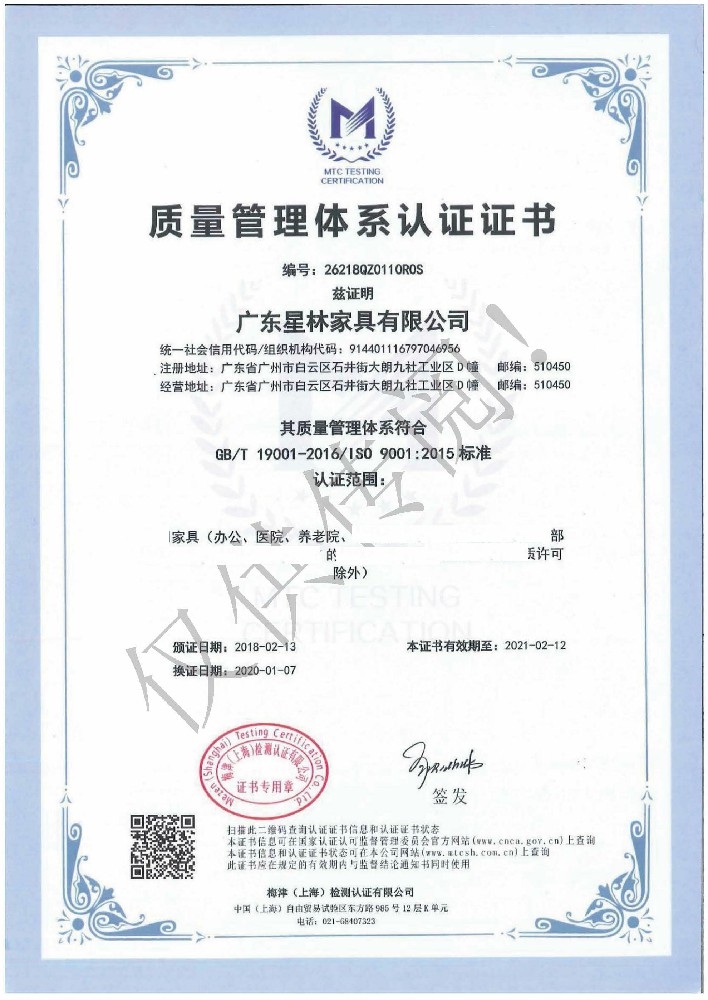 廣東星林家具有限公司創(chuàng)建于家具盛世之期,專業(yè)致力于辦公家具、醫(yī)療家具、養(yǎng)老家具的開發(fā)、設(shè)計(jì)、生產(chǎn)。公司率先通過ISO9001質(zhì)量管理體系認(rèn)證和ISO14001環(huán)境管理體系認(rèn)證及職業(yè)健康安全管理體系認(rèn)證,從而獲得了中環(huán)聯(lián)合(北京)認(rèn)證中心有限公司頒發(fā)的“中國環(huán)境標(biāo)志產(chǎn)品認(rèn)證證書(十環(huán)認(rèn)證)”等。